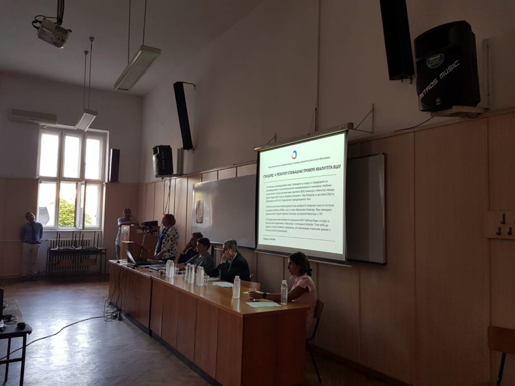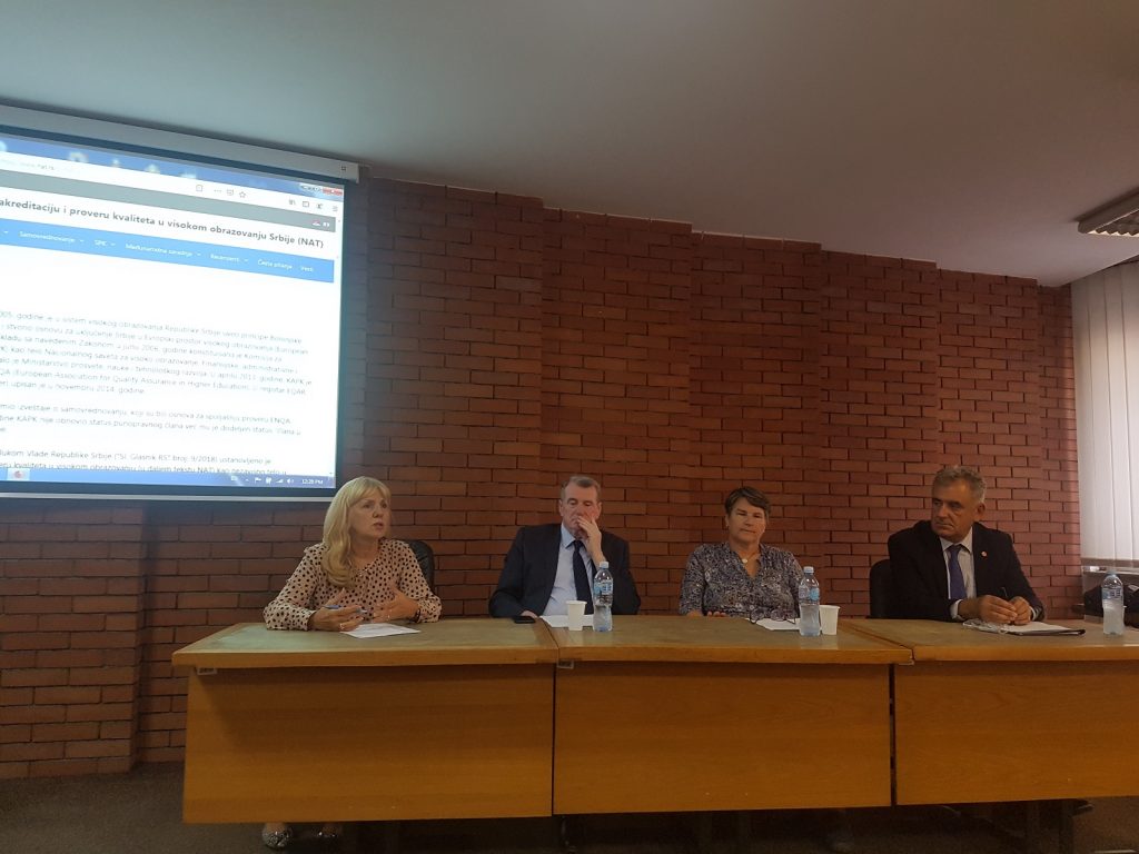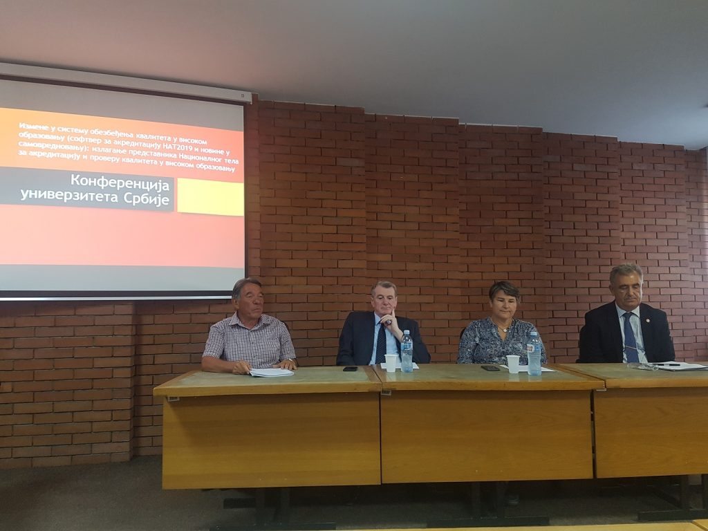 Na poziv rektorke Popović, direktorka Nacionalnog akreditacionog tela – NAT, prof. dr Jelena Kočović, i predsednica Komisije za akreditaciju i proveru kvaliteta – KAPK, prof. dr Ana Šijački, obratile su se delegatima na drugoj redovnoj sednici Skupštine Konferencije univerziteta Srbije, koja je održana 17. septembra 2019. godine na Filološkom fakultetu Univerziteta u Beogradu. Prof. Kočović i prof. Šijački upoznale su predstavnike univerziteta sa rezultatima rada Nacionalnog akreditacionog tela i izmenama u sistemu obezbeđenja kvaliteta u visokom obrazovanju u Srbiji, koje je doneo novi Zakon o visokom obrazovanju i novi podzakonski akti u oblasti akreditacije i obezbeđenja kvaliteta u visokom obrazovanju. Nakon uvodnih obraćanja prof. Kočović i prof. Šijački, prof. dr Ivana Stojanović, članica KAPK, predstavila je novine u procesima spoljašnje provere kvaliteta sa osvrtom na protokol posete recenzentskih komisija visokoškolskim ustanovama, standarde za spoljašnju proveru kvaliteta i samovrednovanje visokoškolskih ustanova i studijskih programa i formu recenzentskog izveštaja o spoljašnjoj proveri kvaliteta.